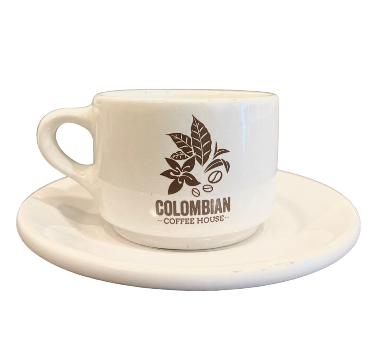 Enjoy these glossy white 3oz espresso glasses and saucers with the CCH logo. The perfect gift set. Order comes with two espresso glasses and two saucers.